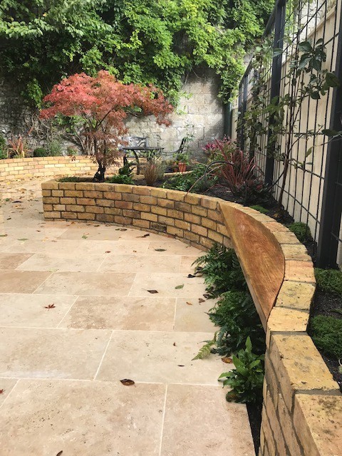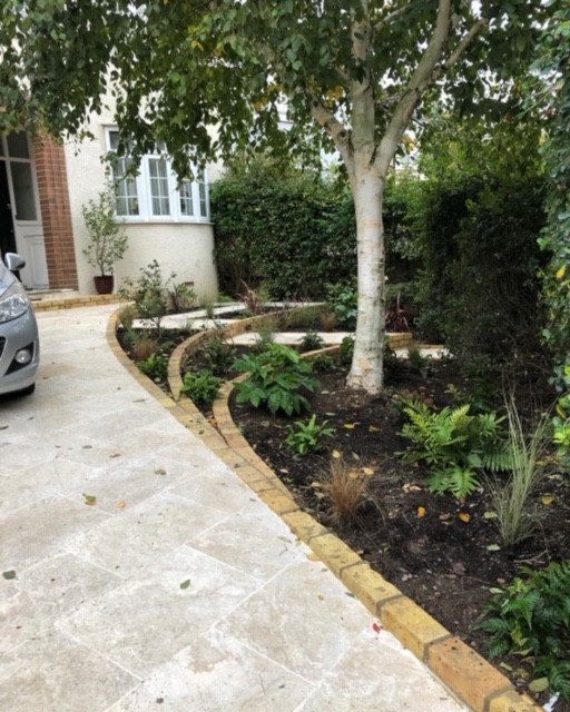 Client brief - Create a light and inviting courtyard style garden to compliment the new extension with a secure bike store. Front garden and driveway to follow theme.